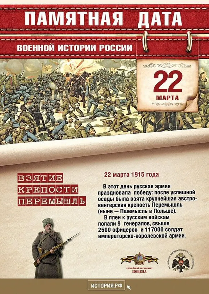 22 марта 1915 года — дата взятия крепости Перемышль русской армией в ходе Первой мировой войны. Разберём событие подробнее: